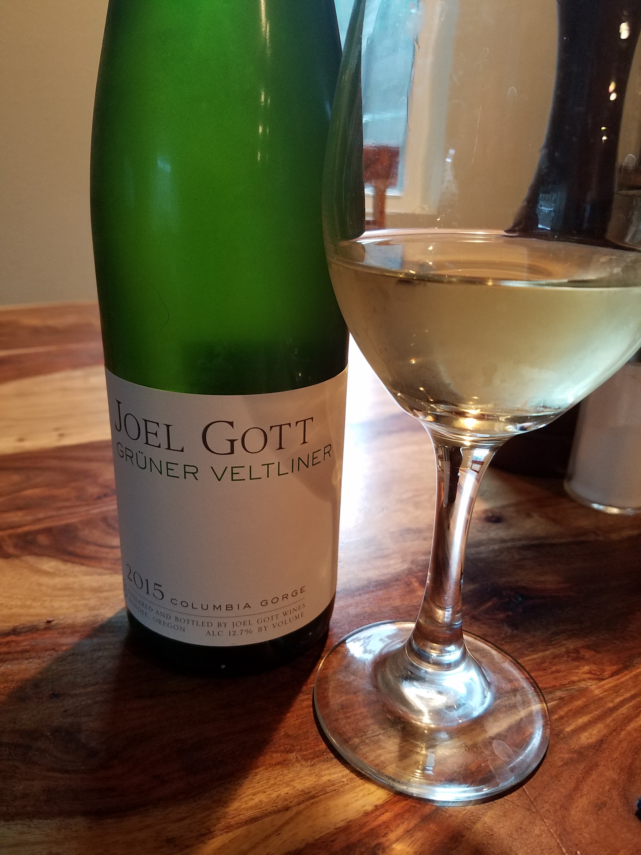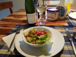 Tonight the wine was a white wine from Oregon, Joel Gott, a Gruener Veltliner from Columbia Gorge. The wine was a soft wine, a little to delicate for the chicken, but we didn’t have any Pinot Grigio, so it made do.