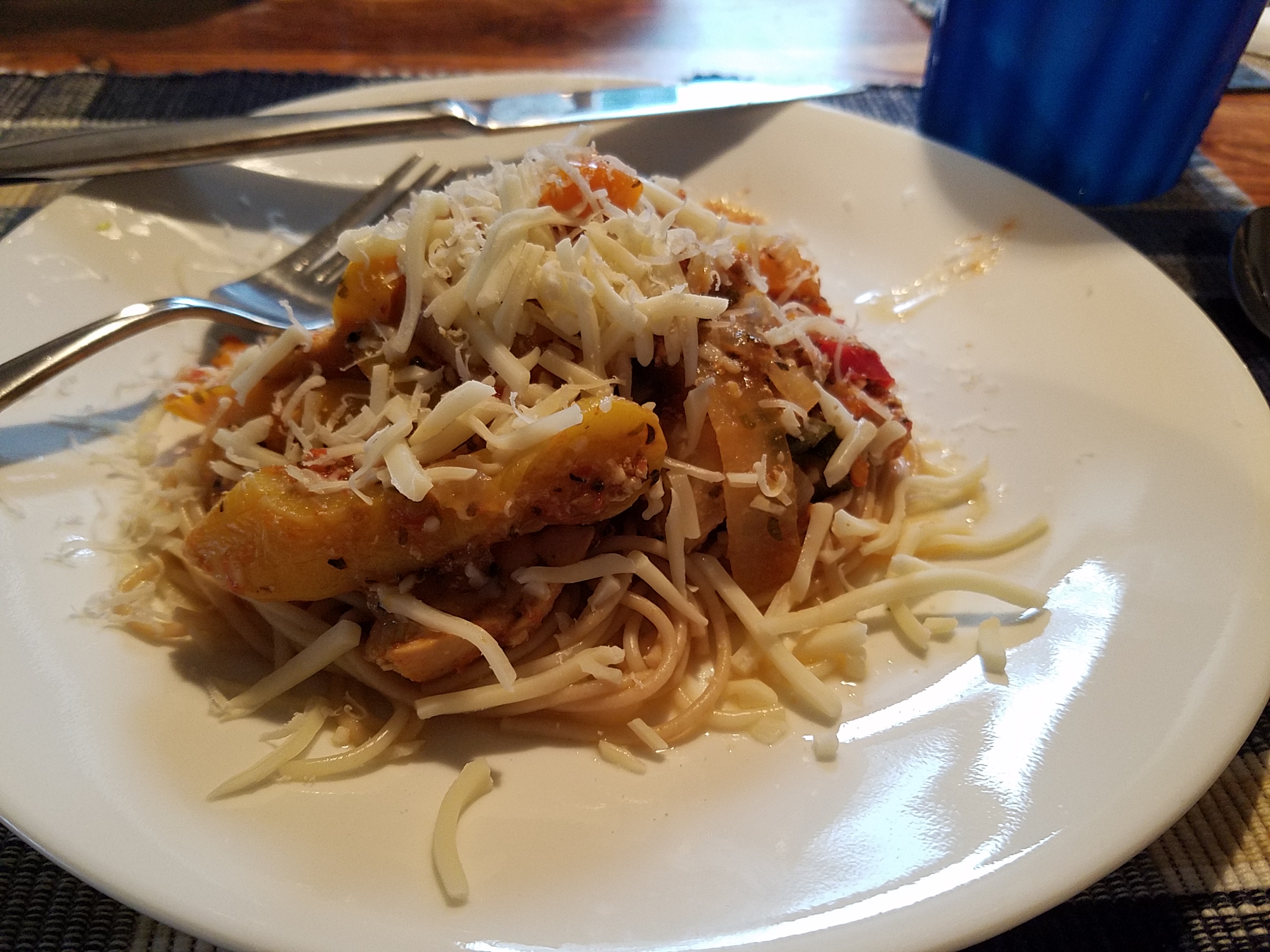 Tonight dinner was a favorite of ours. Chicken Primavera, salad and wine. Chicken Primavera is a dish I came up with a long time ago. Chicken cut up into strips and sautéed with onions, peppers and zucchini with diced tomatoes and Italian herbs. An easy dish and so good in the cold weather. Accompany that with a tossed salad and a nice wine, white or red and dinner becomes a cozy romantic evening.